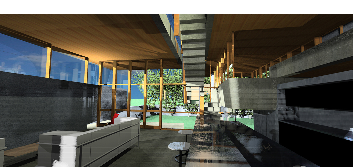 2011—Lynwood Rework A collaboration with Bill Brinkey, Architect. Create a floating roof with 5 carefully placed skylights, and clean up volumetrics at street elevations with glazing & masonry blocks & planes. |