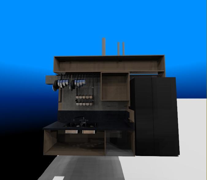 System is supported by a steel tube frame so that most of it hovers 12' above the floor to keep the space feeling larger, and to eliminate that void-space behind the toe-kick at the base of the cabinets.