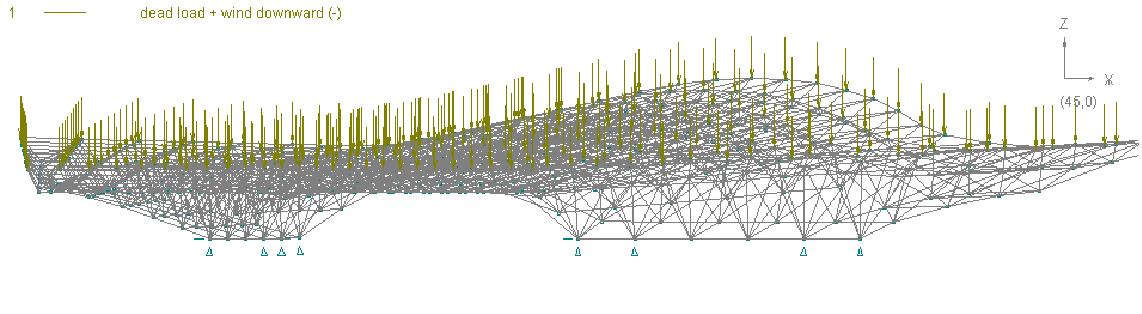 Right: Screen shot of SpaceGass structural analysis model with loading and restraints. |