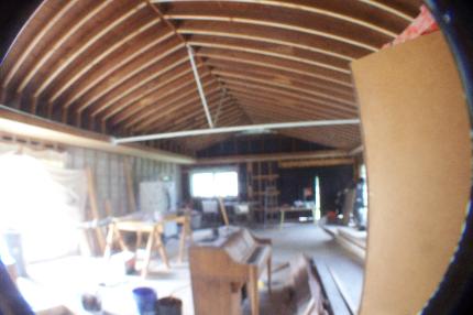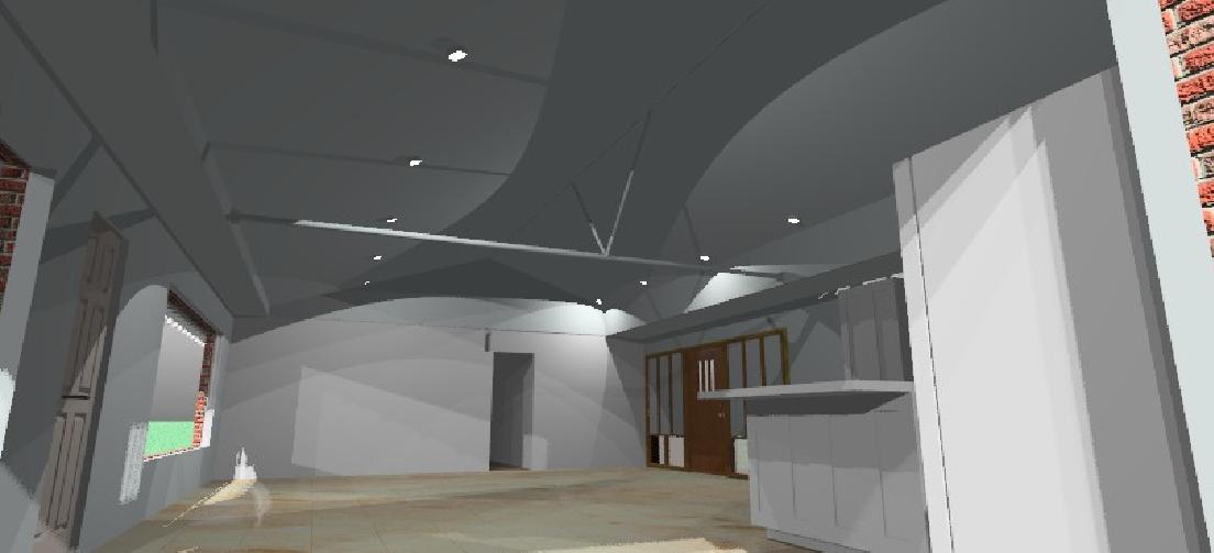 Solution: Create lateral thrust trusses at wall/roof joint, using a single laterally braced "tie-rod" which is a finished element and acts as a tension/compression member for entire overhead system.