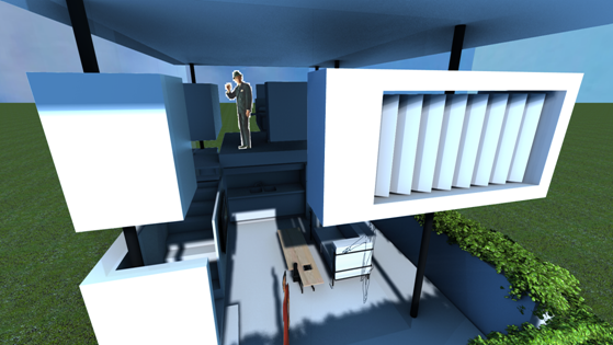 Another idea built into this model is a switchable frosted glass layer at the first 5ft of glass wall for privacy when wanted. This concept will carry into the double level tinyHouse that will be moved forward. |