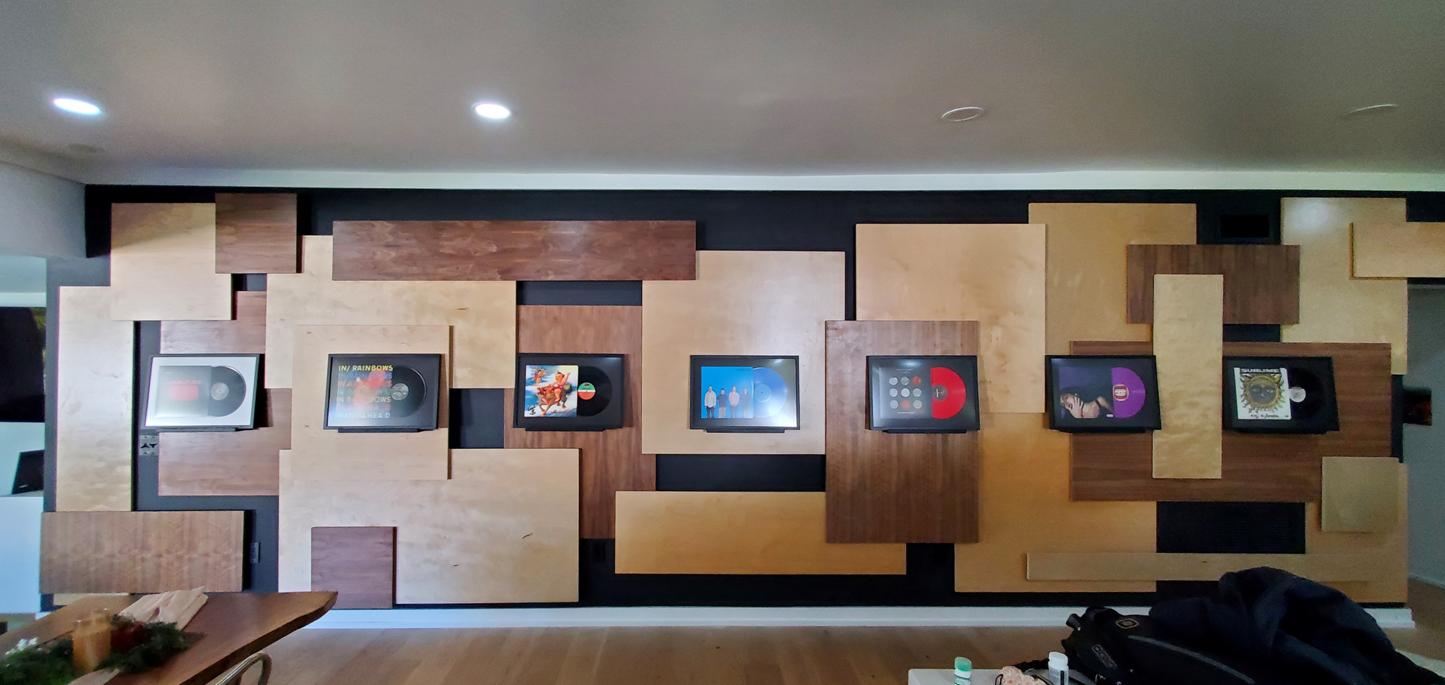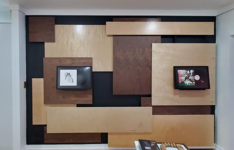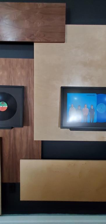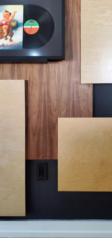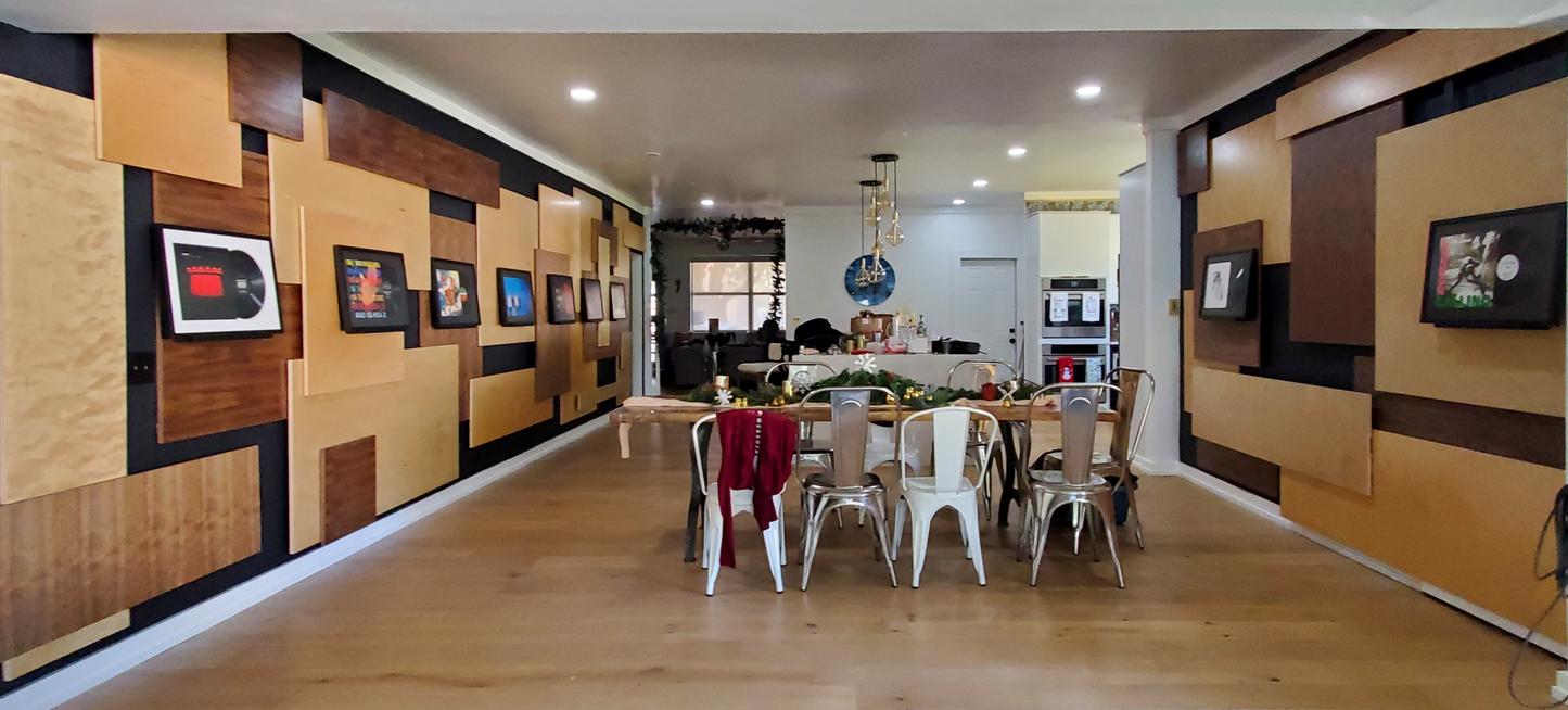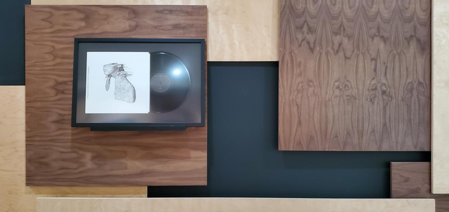 The composition is meant to be dispersed and mostly a uniform field providing a layered, busy backdrop for the uniform spacing, height, and display of the owner’s collection of lp albums and their covers. The idea is that they can be changed out easily and so the frames are set on a ledge designed with an angled groove so the frames will not fall over and will naturally want to fall against the panel wall. This way swapping records & albums is as easy as pulling a book off of a shelf. |