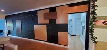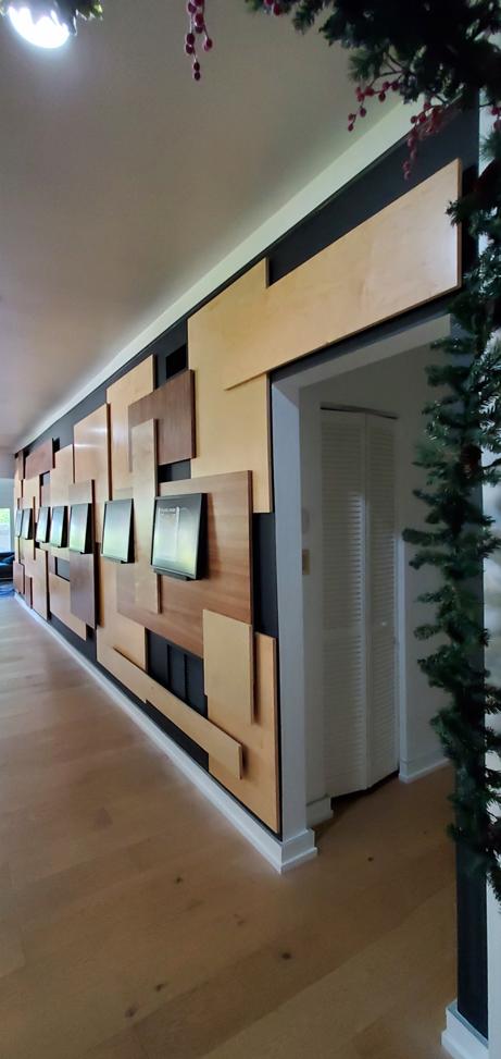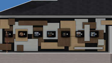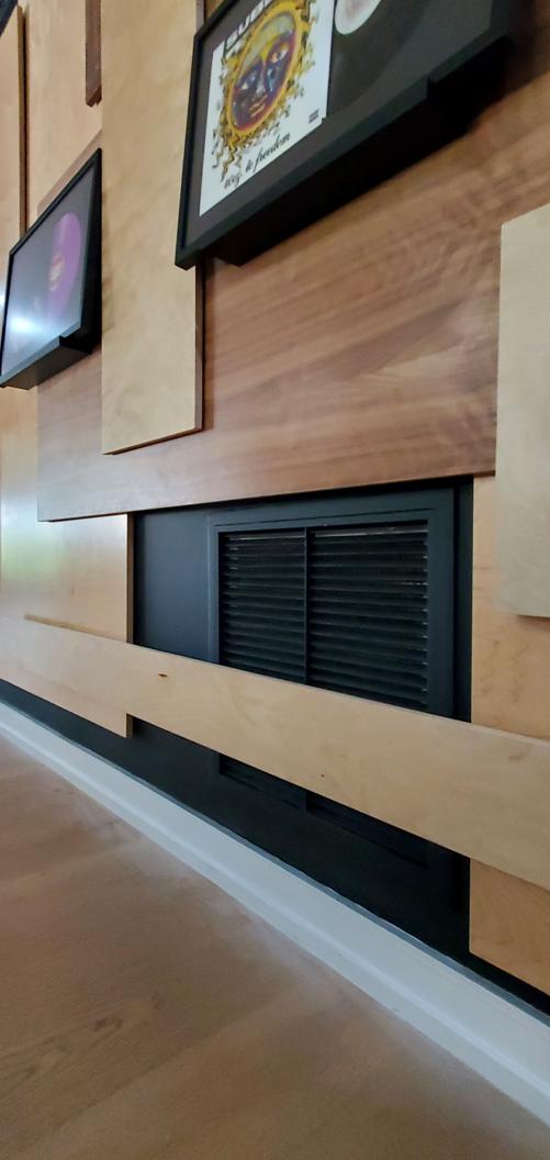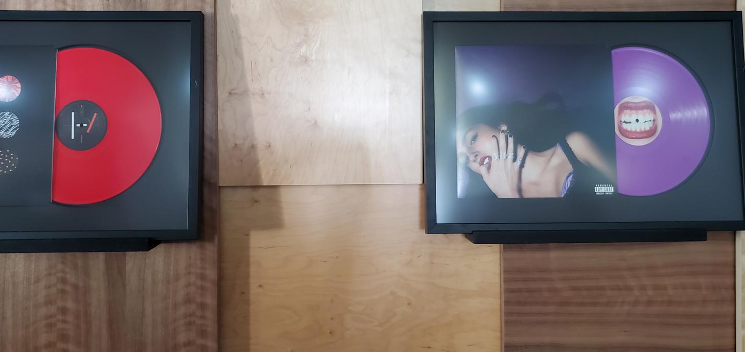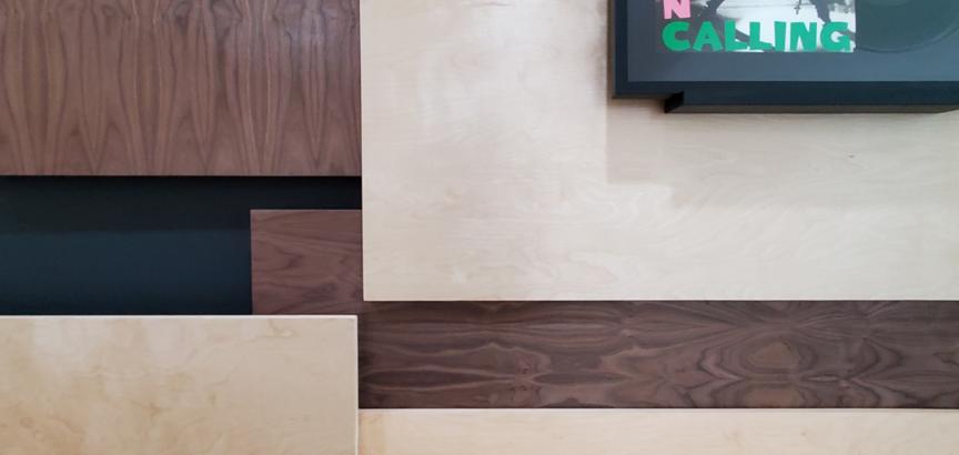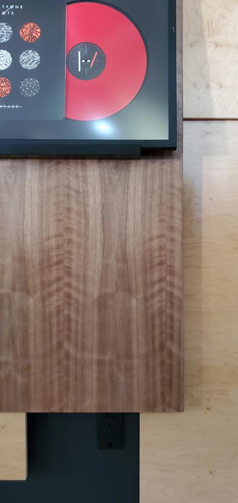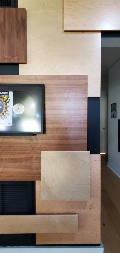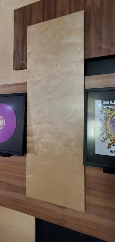 The composition is meant to be dispersed and mostly a uniform field providing a layered, busy backdrop for the uniform spacing, height, and display of the owner’s collection of lp albums and their covers. The idea is that they can be changed out easily and so the frames are set on a ledge designed with an angled groove so the frames will not fall over and will naturally want to fall against the panel wall. This way swapping records & albums is as easy as pulling a book off of a shelf. |