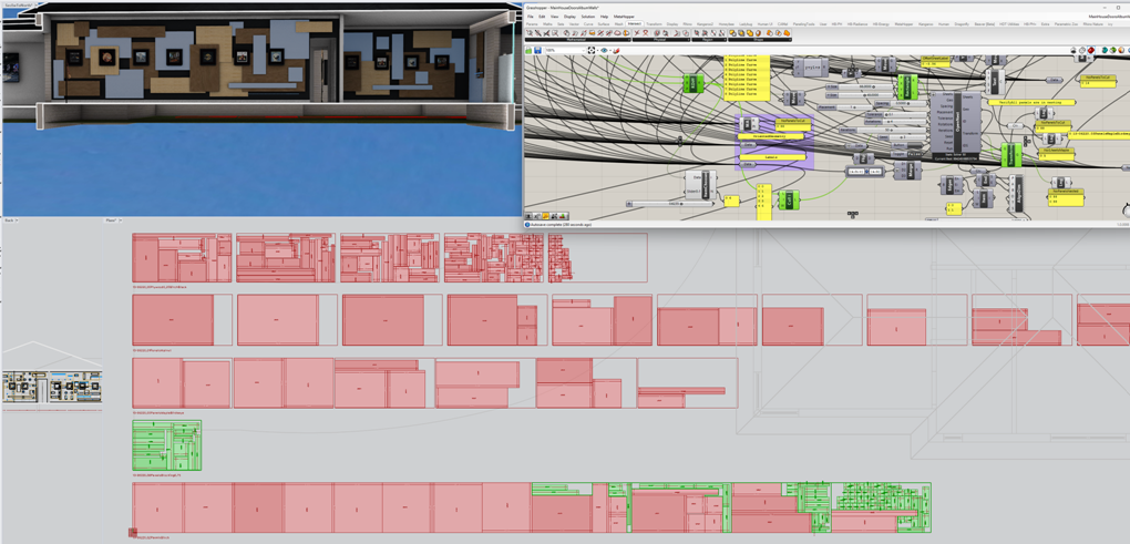 Right: The panel nesting operation to define the cutting sequence & sheets required. Done directly from the Rhino model using grasshopper and OpenNest—a great nesting component.