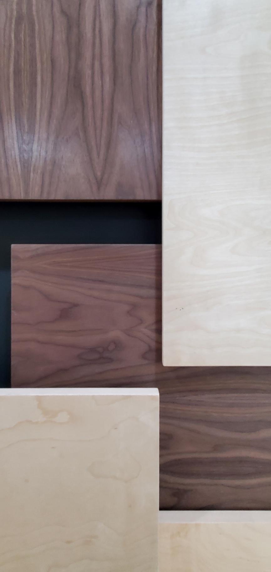 The panels are made of 3 species of plywood: Walnut, Birch, and Maple. The Birch and Maple were found prefinished one side but the Walnut was only available raw & had to be finished with 4 coats of Polycrylic and waxed.