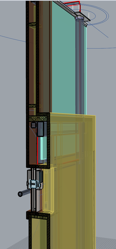 This Door is a sort of variation on the layered concept derived from the site’s existing structure and the owner. Continuing the language defined in the Album Wall, the Main entry door is two shifted planes, one birch, one walnut plywood. The glass panels have an electrochromic film that can change from frosted to clear from a wall switch or from the owner’s smartPhone. |