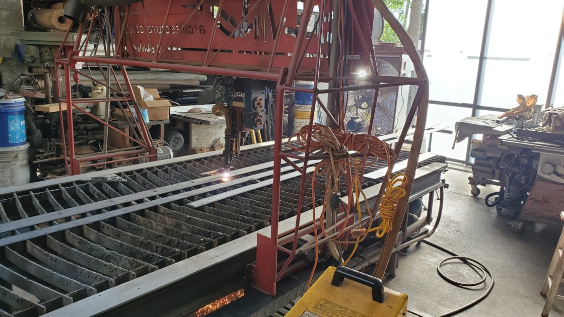 Plasma cutting the anchor holes in the steel flat bar straps that will reinforce the concrete beam between the east room & the kitchen/dining area |