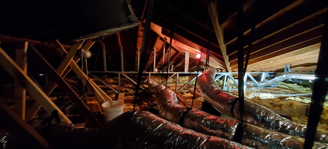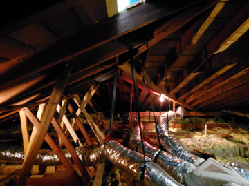Above: the attic before the fix . . . Notice the excuse for ceiling support, the haphazzard 2x4’s—many not even nailed into the joists . . . !! |
