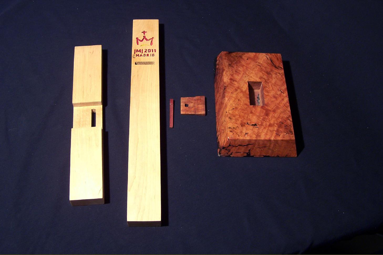 A study in natural wood textures with CNC generated etching and parts integration.Cross: hard white mapleBase & flat wedge: Eucalyptus burlVertical Pin: PadoukLogo: CNC router etched.