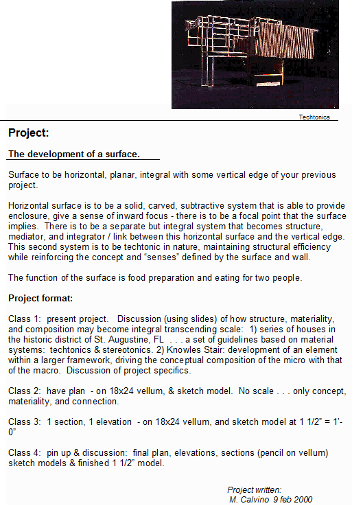 The use of specific building materials is based on the qualities of each and every material that goes into the composition of the space. As an example: concrete is a material that is massive, solid, cold to the touch, it requires considerably more volume of this material (than say steel) to structurally handle loads. Concrete is also monolithic and has the ability to form joints and connections with no visible, additional fasteners . . . as with steel or wood . . . all of these qualities of concrete are unique. Stereotonic comes from the two Greek words: Stere- or Stereo- meaning solid, solid body, having or dealing with three dimensions of space; and the second syllable of tektonikos- of a builder. So the term stereotonic is a building system having qualities of solidity, carved, sculpted. Now I use the term system because it is just that. A building system is like an element on a palette . . . like a color on a painter's paltte, only these two systems are oppositional in their qualities and are thought of as elements of a sculptural composition. The other system is techtonic- from the French word techne - art, craft, skill; from the Greek word tekton - builder, carpenter; and from the Latin texere to weave. Hence a techtonic building system is one which is composed of a series of small, linear elements defining edges etc. with a certain degree of transparency. The use of complimentary material systems is used to clarify elements of the composition, and in turn, the composition as a whole. The stereotonic composition must be able to stand without the tectonic system and still retain the essence of the idea . . . as the ruin does. The tectonic system also must be a composition in itself . . . able to stand apart from the carved system and be read as a tectonic, sculptural element which retains and conveys the essence of the idea.